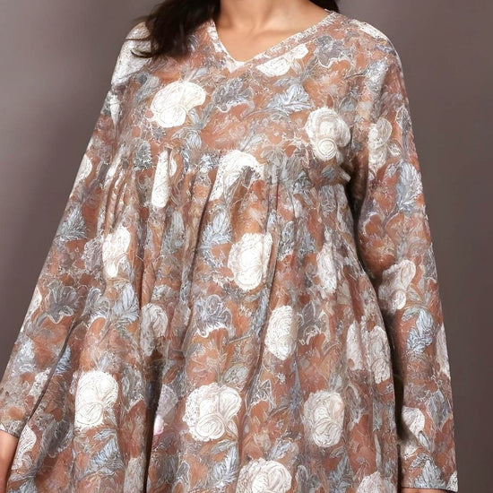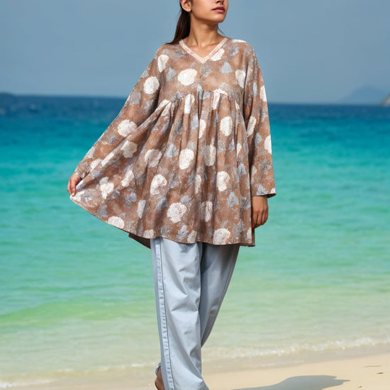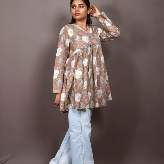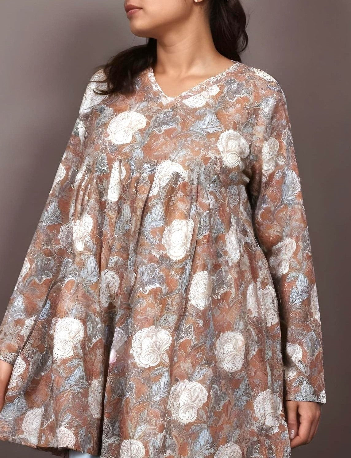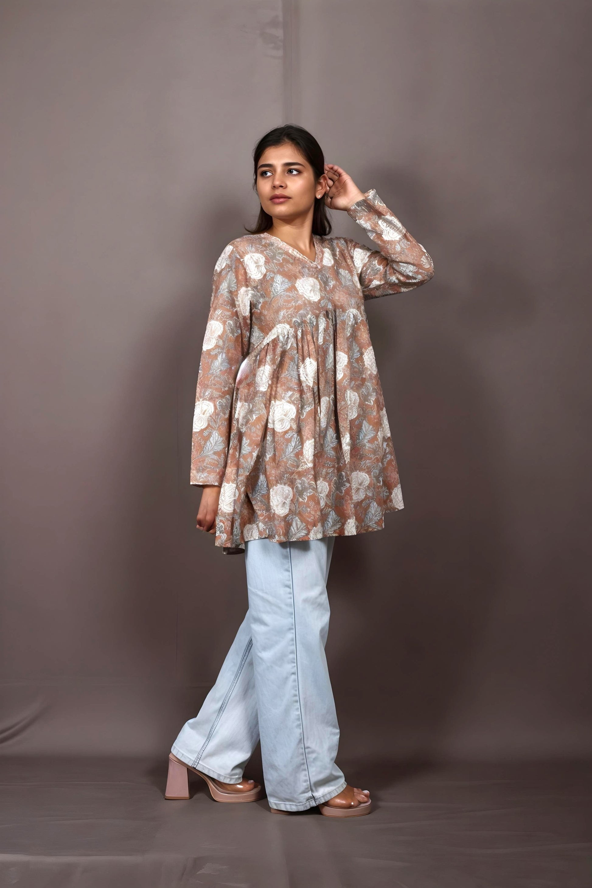 Add a touch of elegance and comfort to your everyday wardrobe with this fine print flared kurti from Nesara. Made from soft, breathable pure cotton fabric, it features an awesome print pattern that blends cultural charm with a traditional silhouette. The short length makes it perfect for pairing with jeans or leggings, offering effortless style for casual outings, workwear, or college.