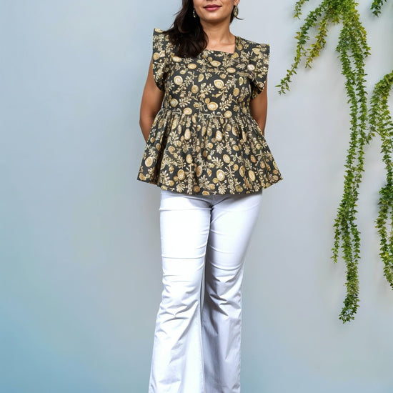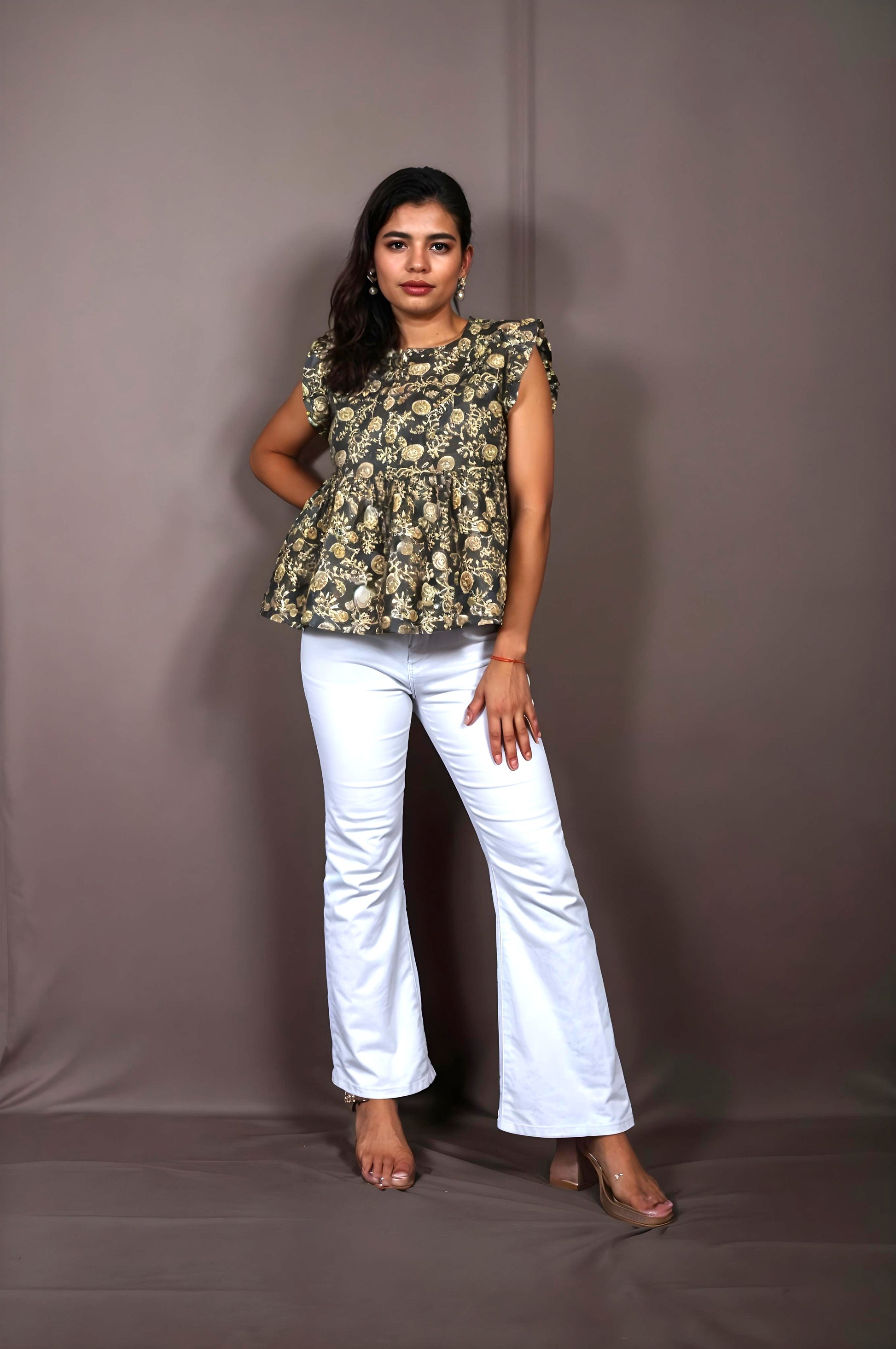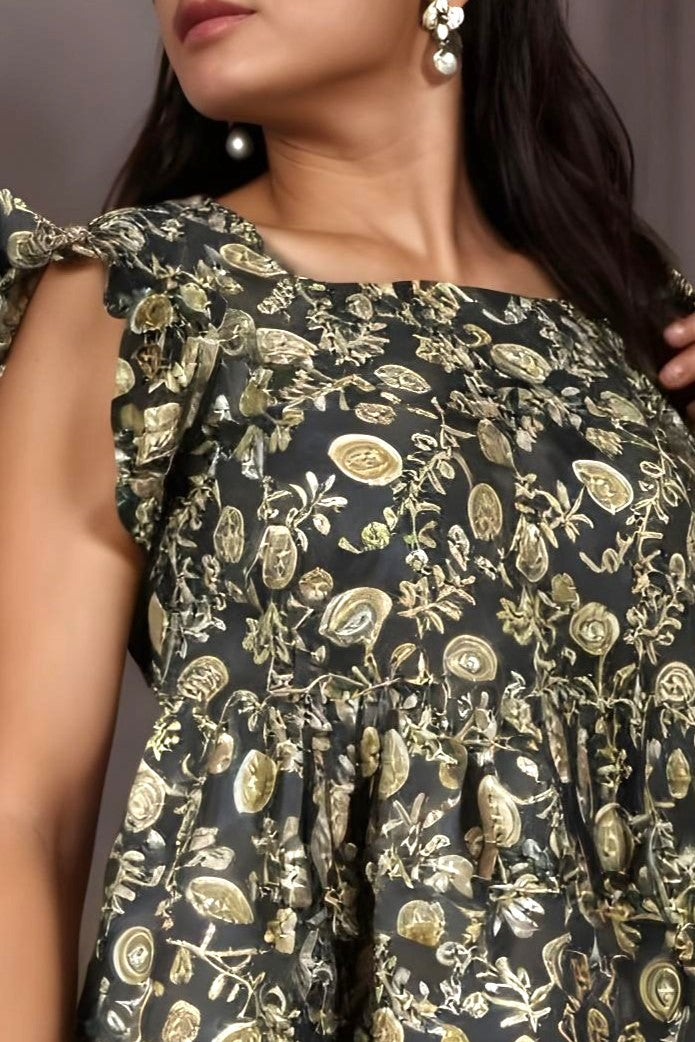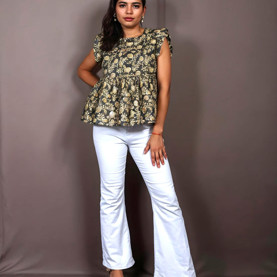 Add a touch of youthful style and awesome comfort to your everyday wardrobe with this fine print ruffled sleeveless short top from Nesara. Made from soft, breathable pure cotton fabric, it features an awesome print pattern that blends cultural charm with a delightful silhouette. The short length makes it ideal for pairing with jeans or palazzos, offering effortless style for casual outings or college.