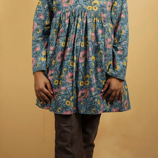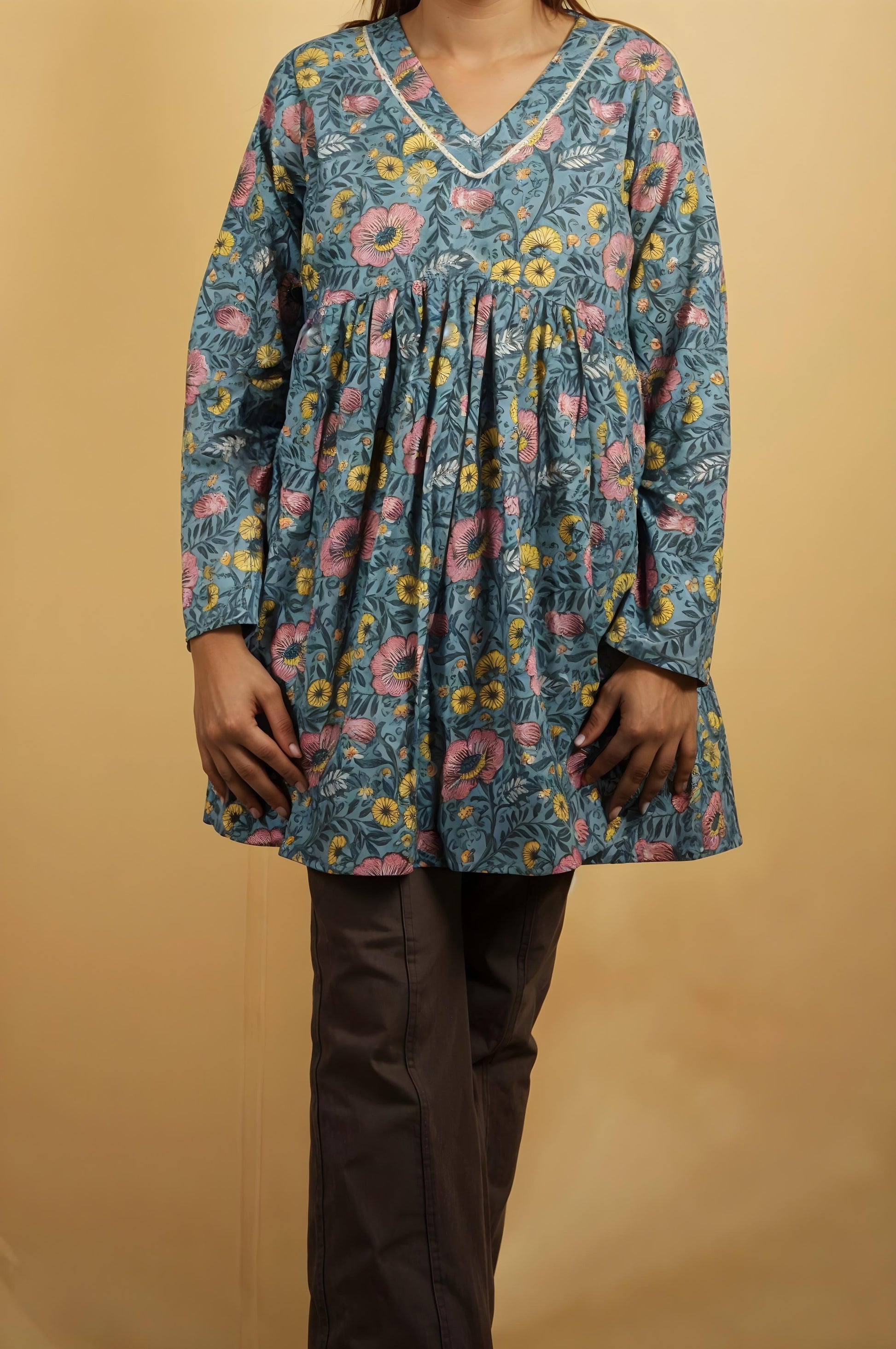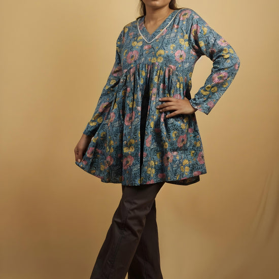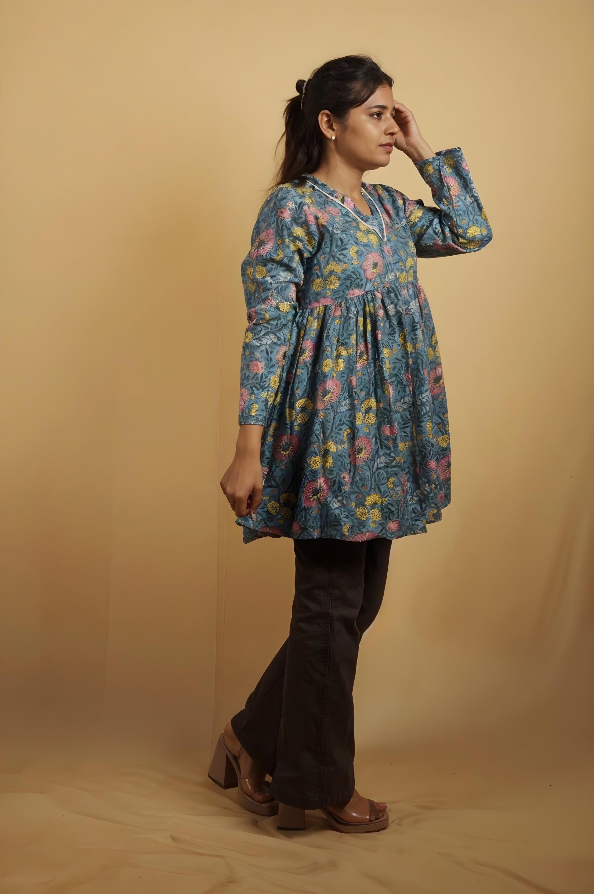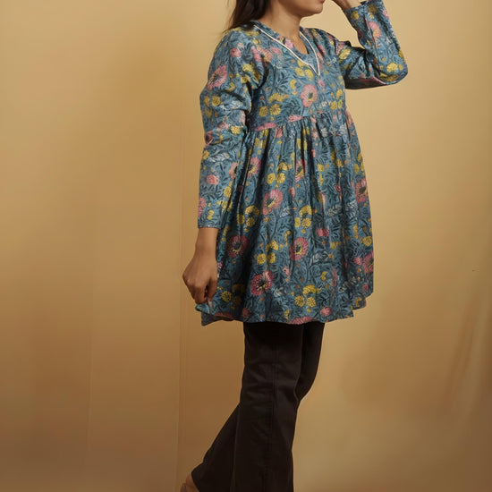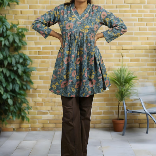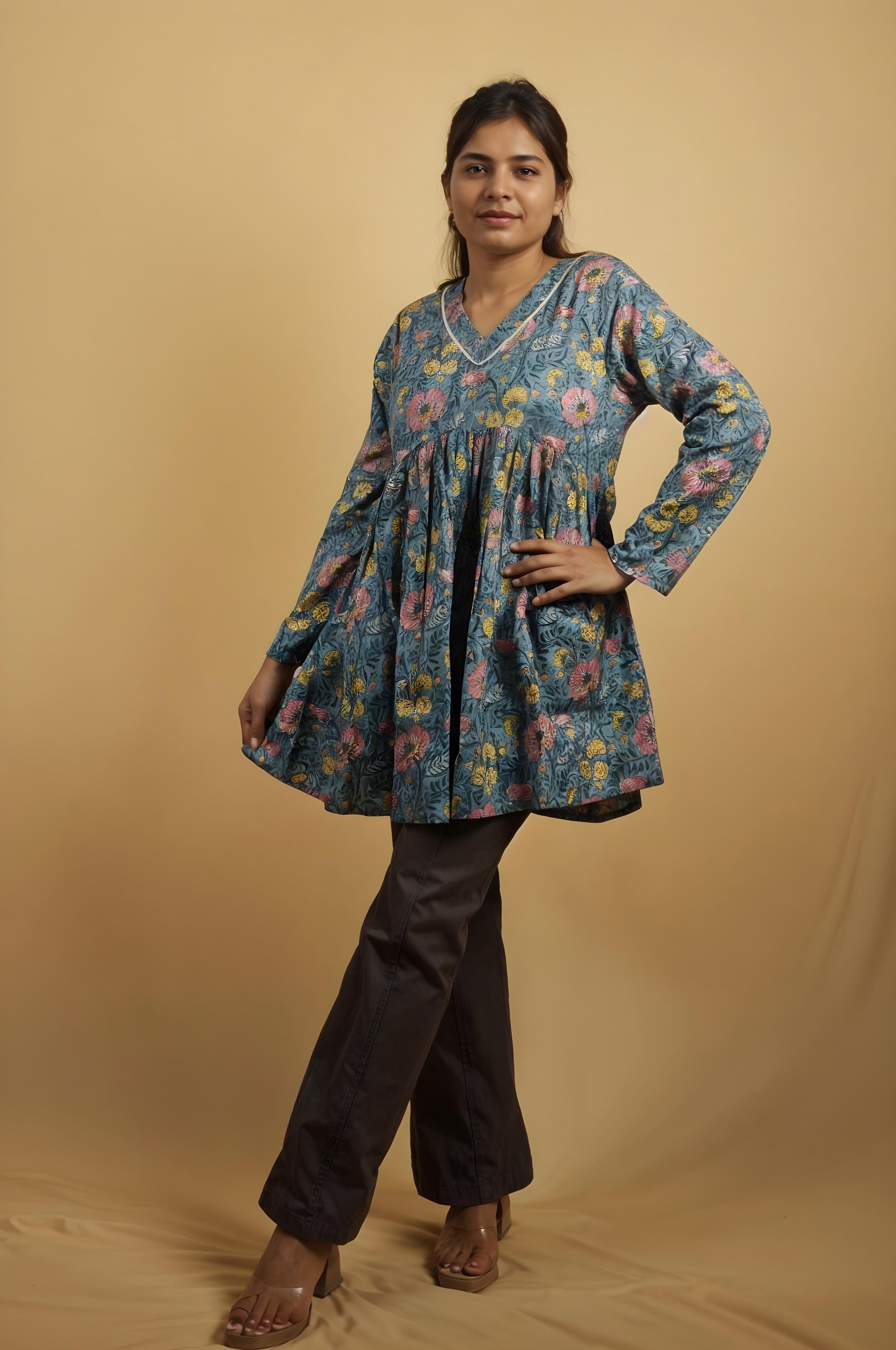 Add a touch of elegance and comfort to your everyday wardrobe with this fine print flared kurti from Nesara. Made from soft, breathable pure cotton fabric, it features an awesome print pattern that blends cultural charm with a traditional silhouette. The medium length makes it perfect for pairing with jeans or leggings, offering effortless style for casual outings, workwear, or college.