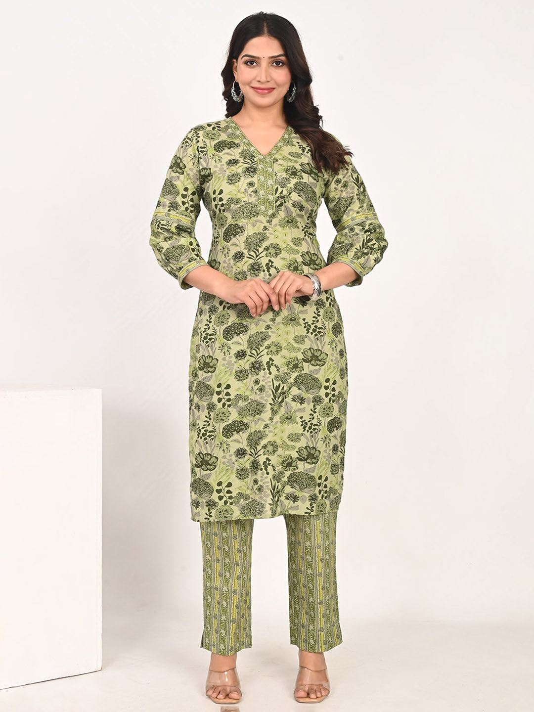 Look stunning in refreshing hues of the season's fashion with this awesome green kurta and pants set from the latest collection of Nesara. Artfully crafted in premium cotton for a naturally soft and gentle feel with fine drape and superb comfort, it is designed with a classic regular fit silhouette and unique printed pattern adds to its allure. Pair it with matching heels for a stunning look.