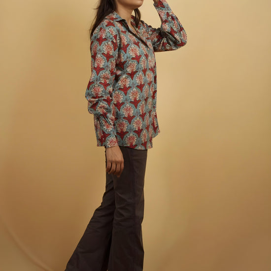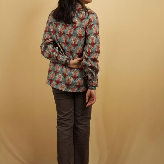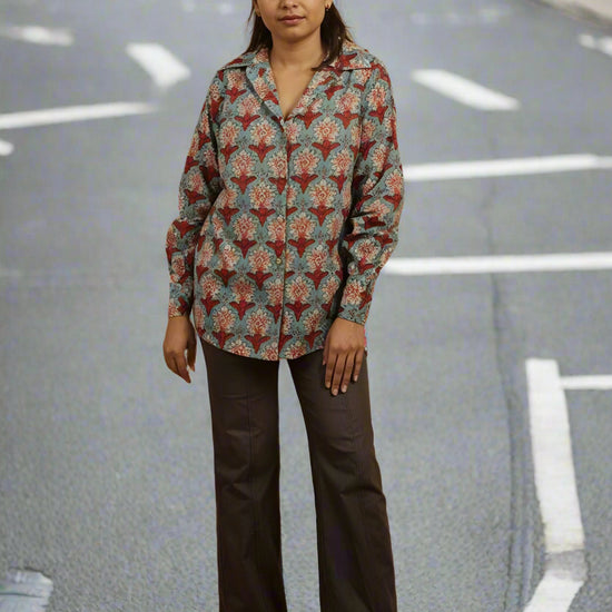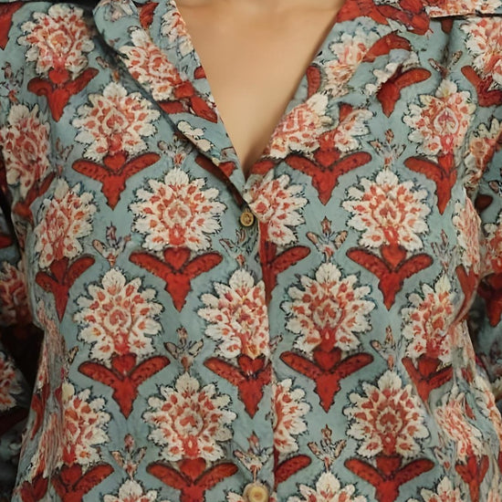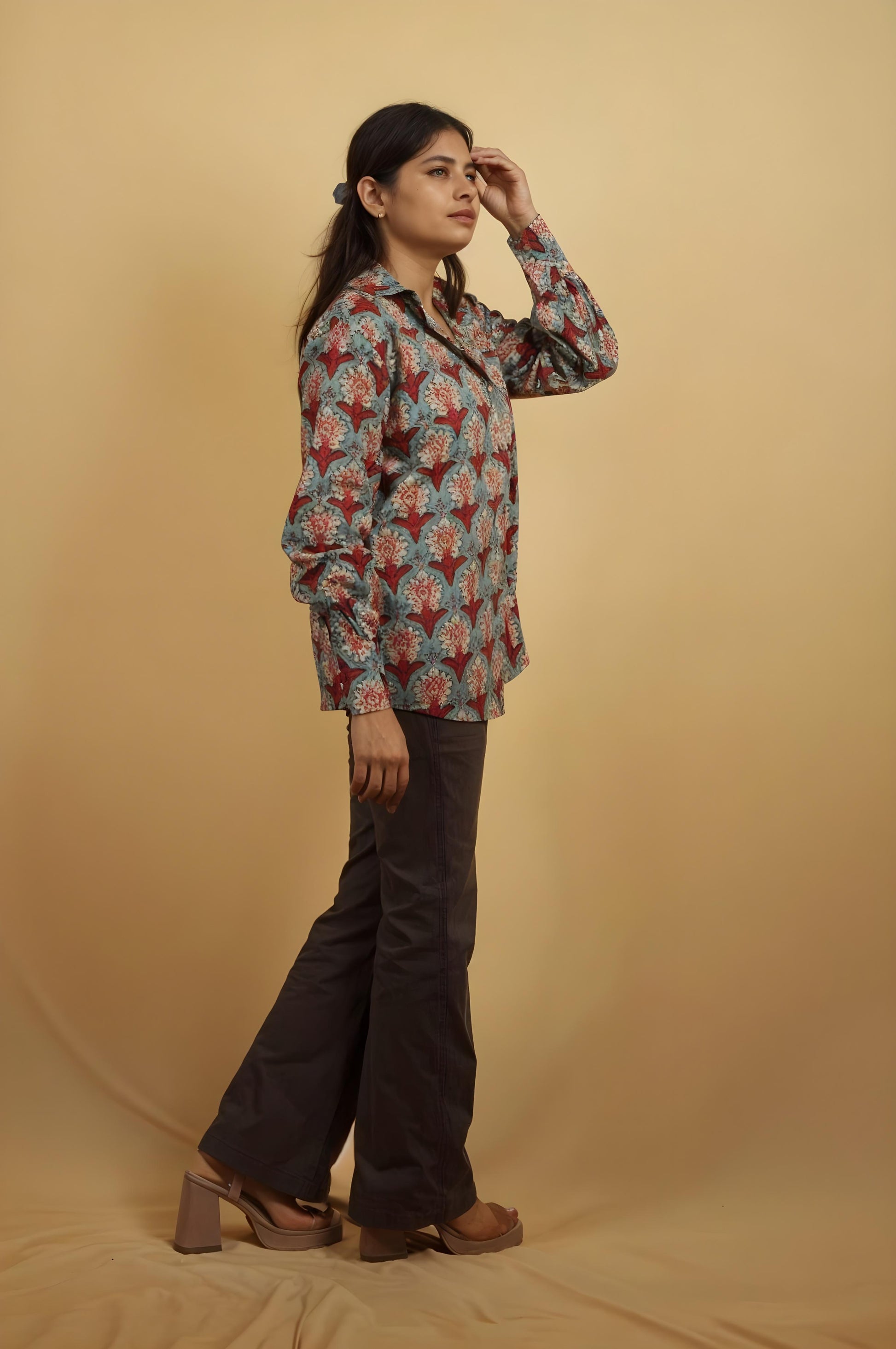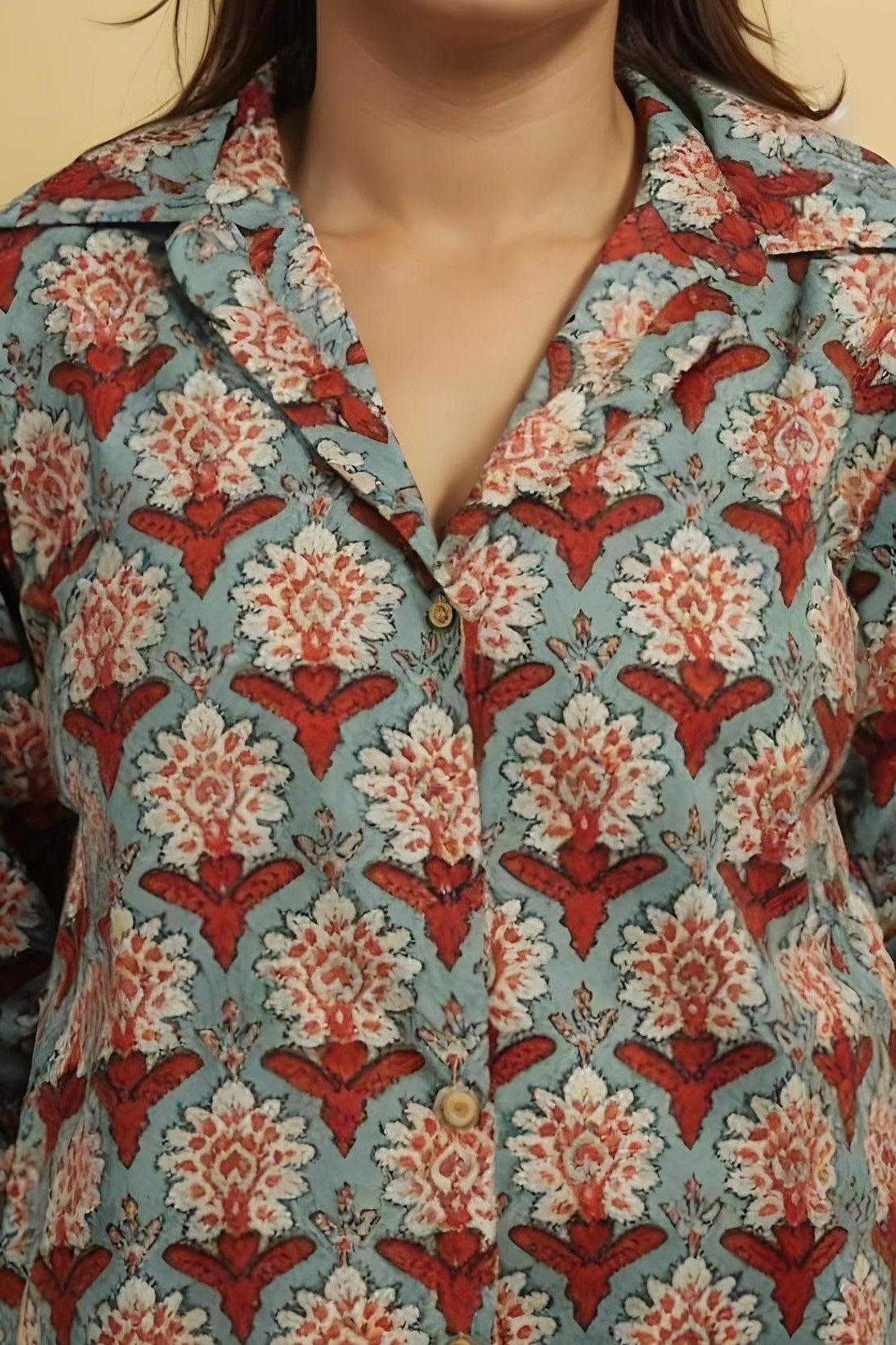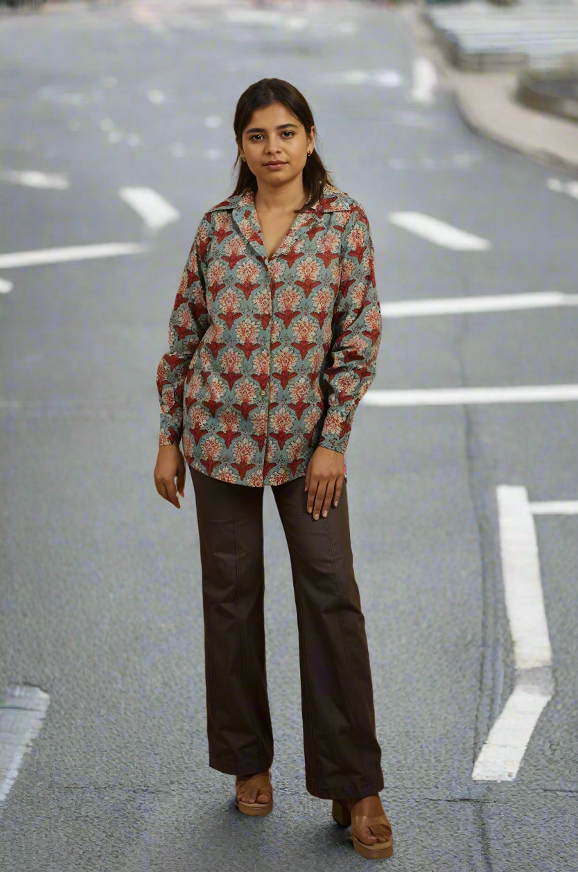 Convey your approach to style and fashion with this awesome oversize shirt in Jaipur print fabric from Nesara. Made from soft, breathable cotton, the shirt features a symmetric print pattern that blends traditional charm with a youthful silhouette. The oversize fit makes it perfect for pairing with jeans or leggings, offering effortless style for casual outings, work, or college.