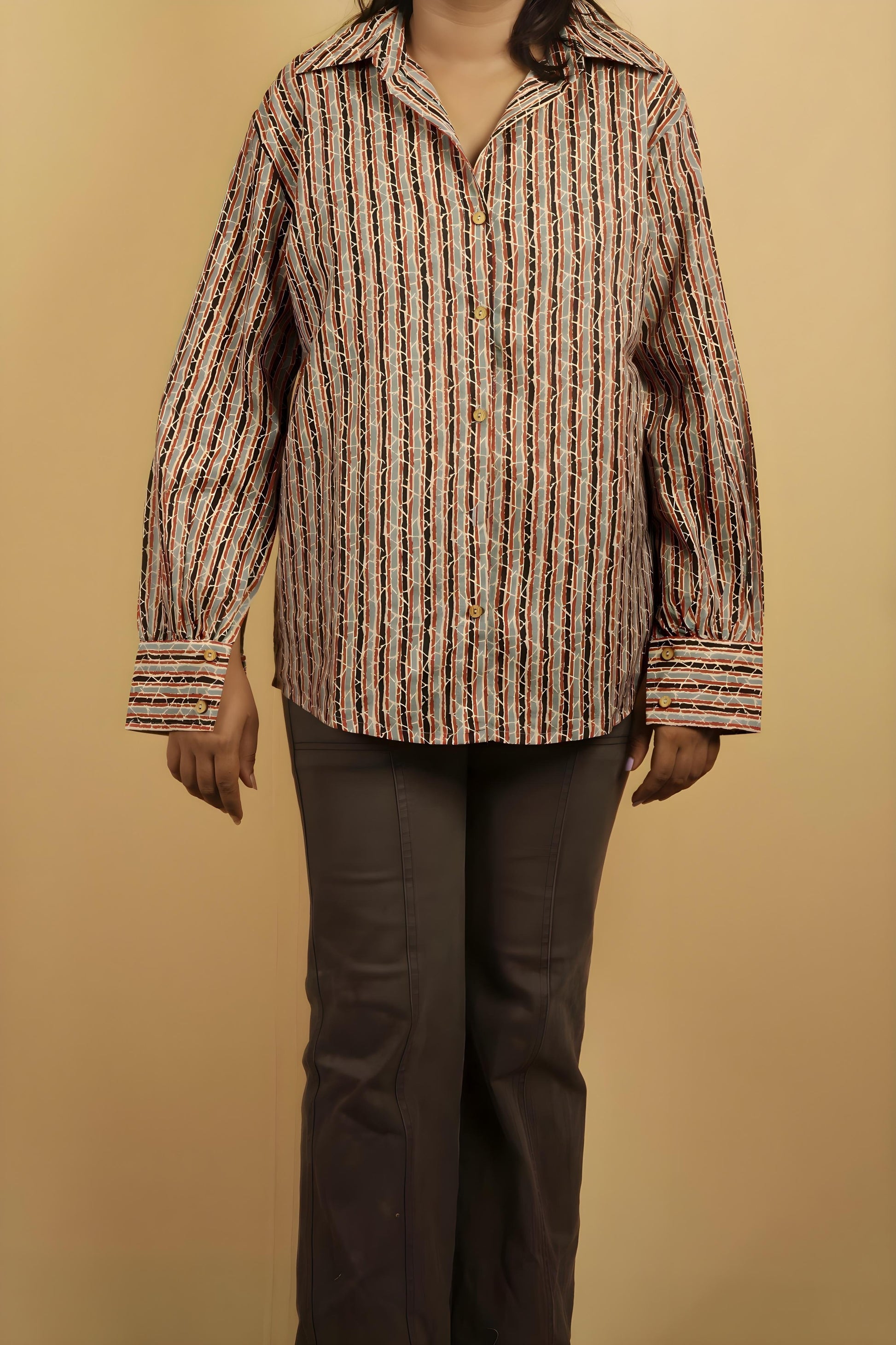 Convey your approach to style and fashion with this awesome oversize shirt in Jaipur print fabric from Nesara. Made from soft, breathable cotton, the shirt features a symmetric print pattern that blends traditional charm with a youthful silhouette. The oversize fit makes it perfect for pairing with jeans or leggings, offering effortless style for casual outings, work, or college.