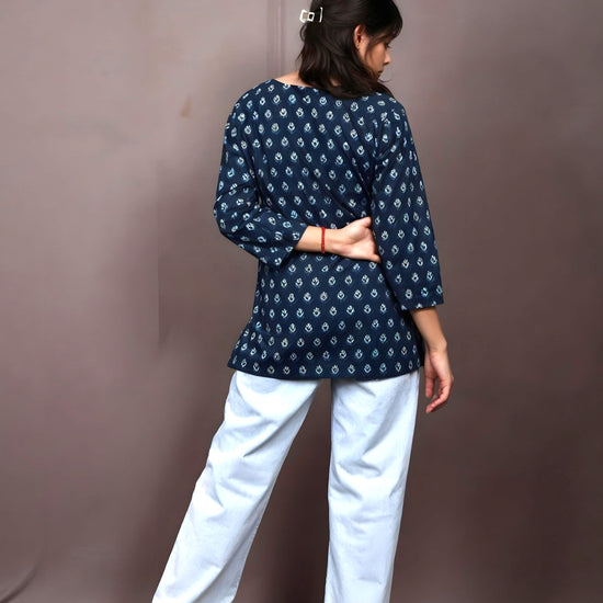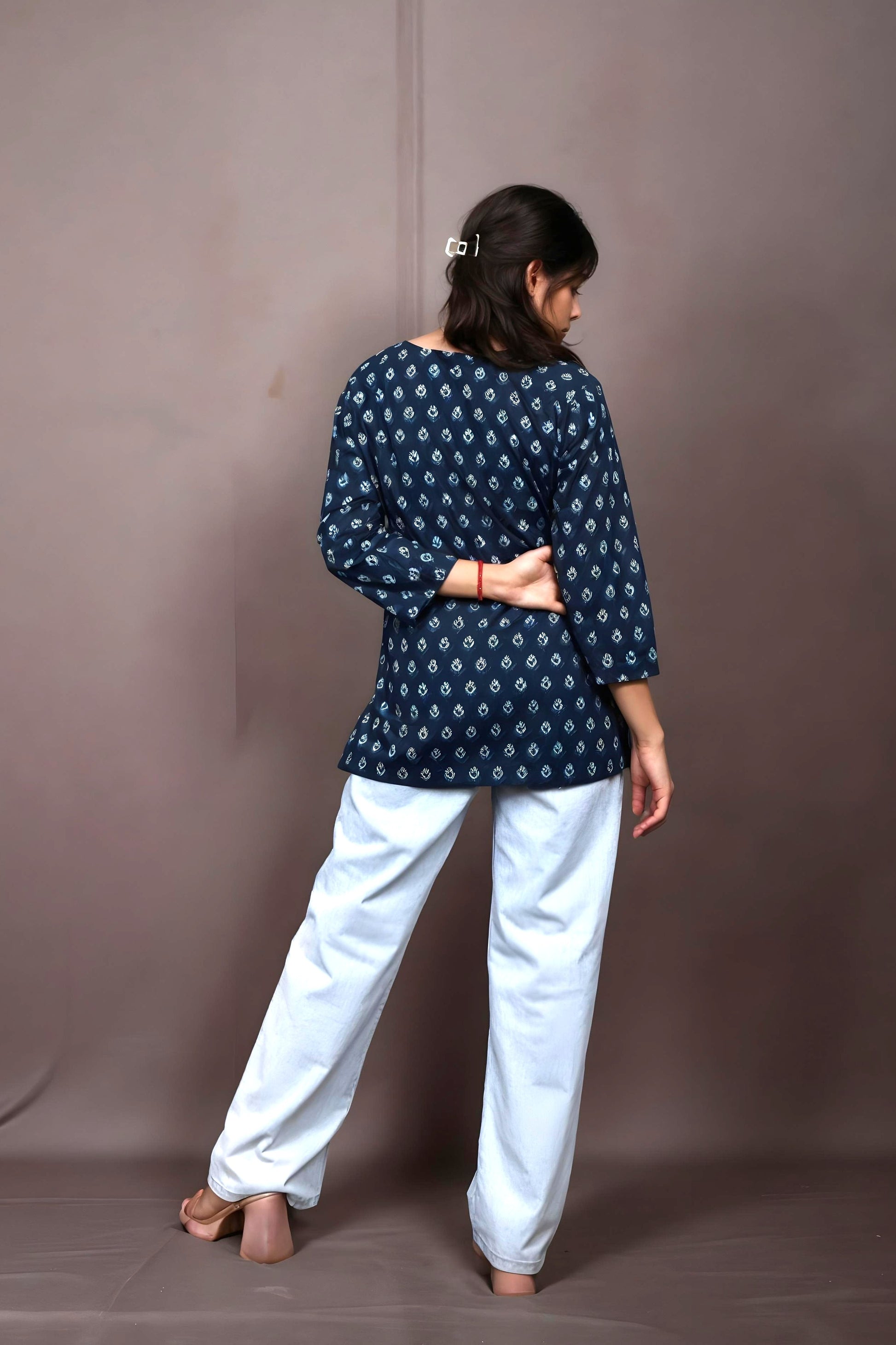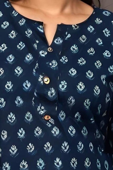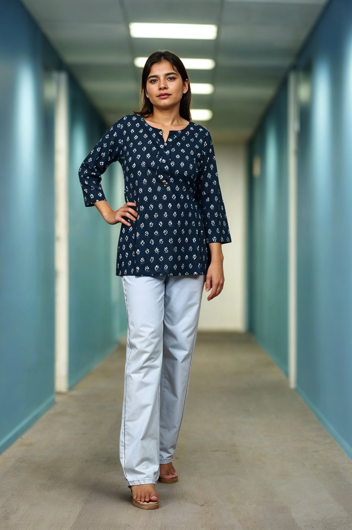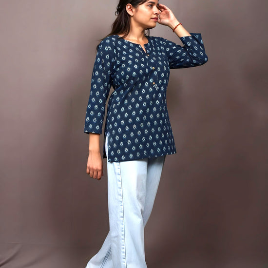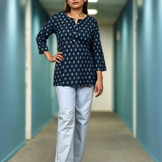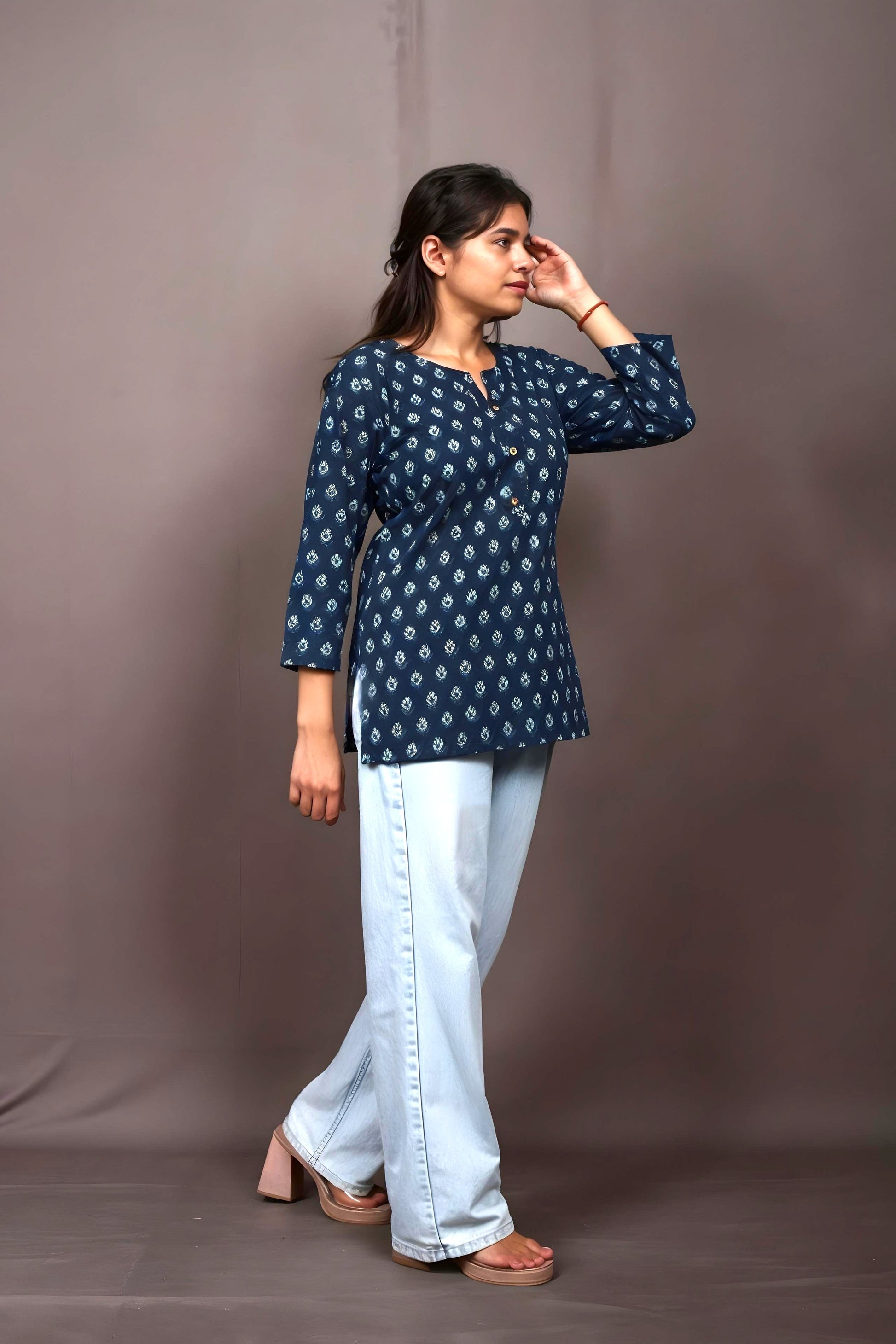 Add a touch of elegance and comfort to your everyday wardrobe with this fine print short kurti from Nesara. Made from soft, breathable pure cotton fabric, it features an awesome print pattern that blends cultural charm with a youthful silhouette. The short length makes it perfect for pairing with jeans or leggings, offering effortless style for casual outings, workwear, or college.