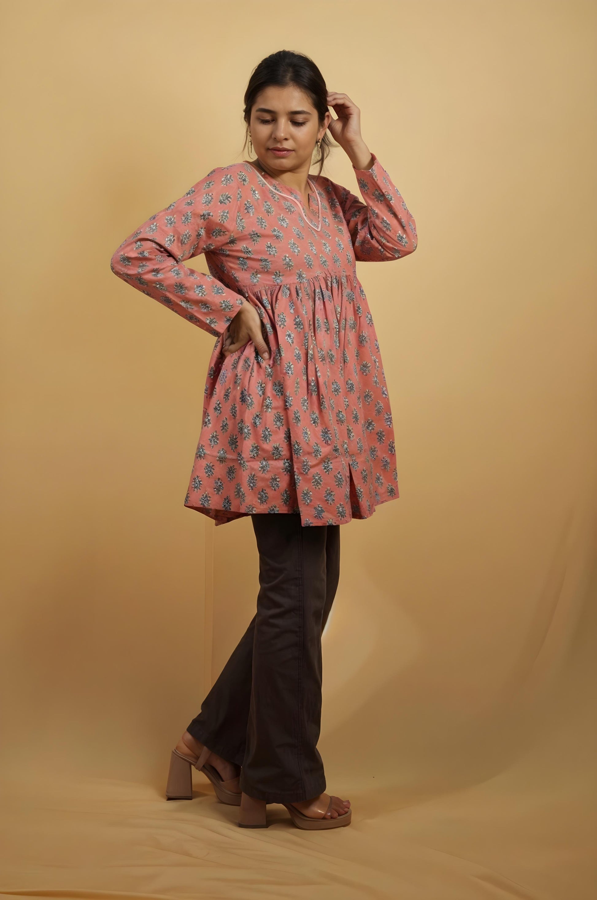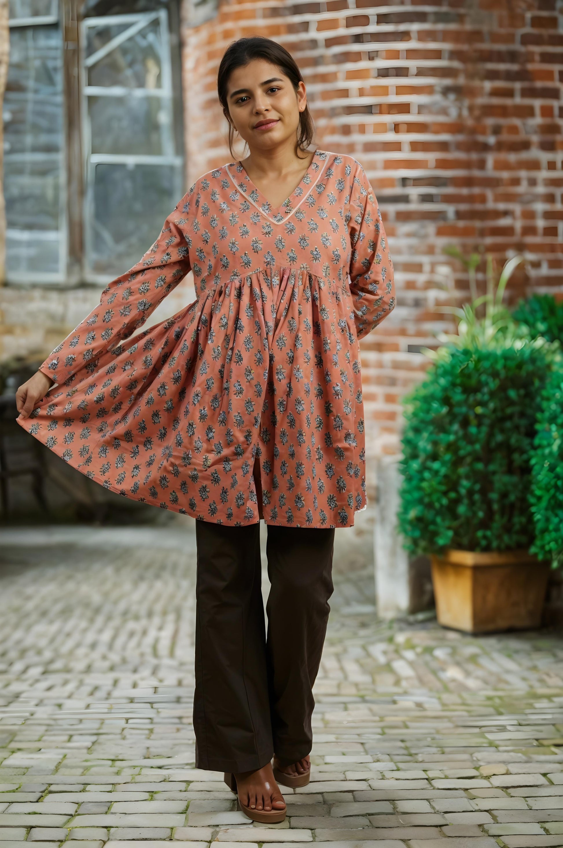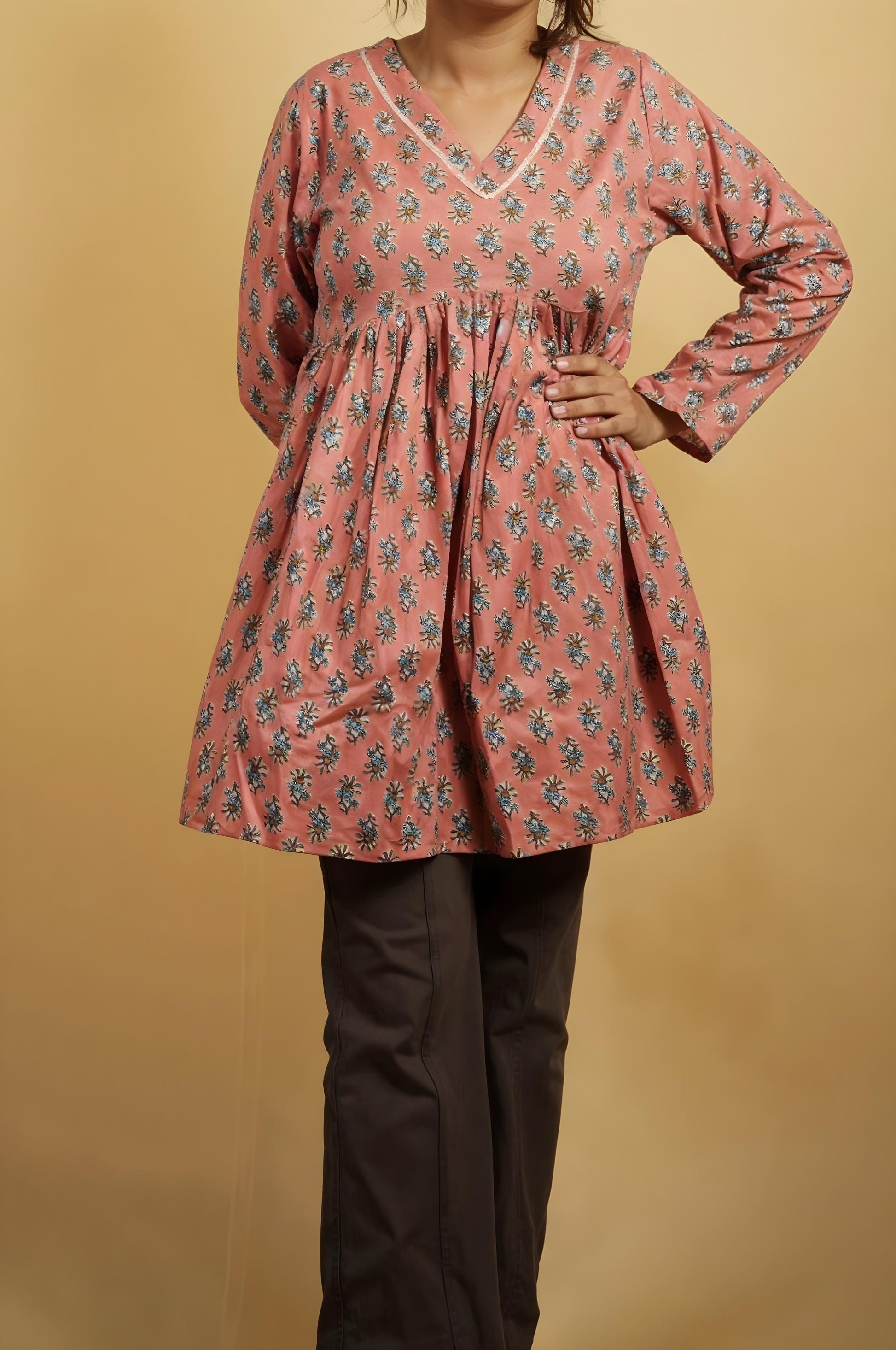 Add a touch of elegance and comfort to your everyday wardrobe with this fine print flared kurti from Nesara. Made from soft, breathable pure cotton fabric, it features an awesome print pattern that blends cultural charm with a traditional silhouette. The medium length makes it perfect for pairing with jeans or leggings, offering effortless style for casual outings, workwear, or college.