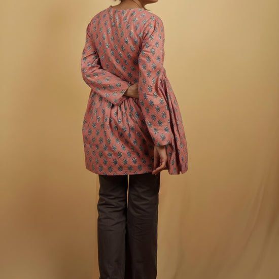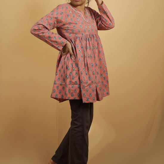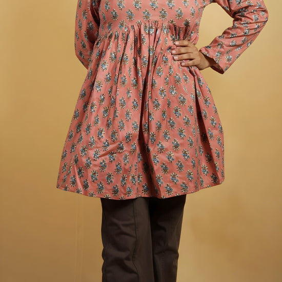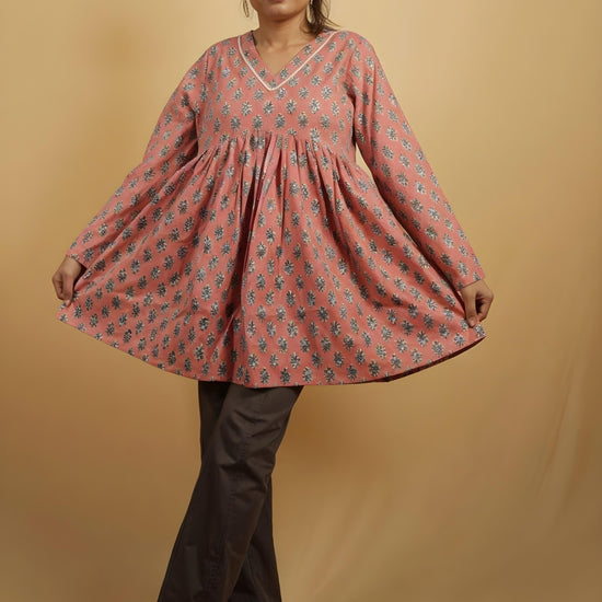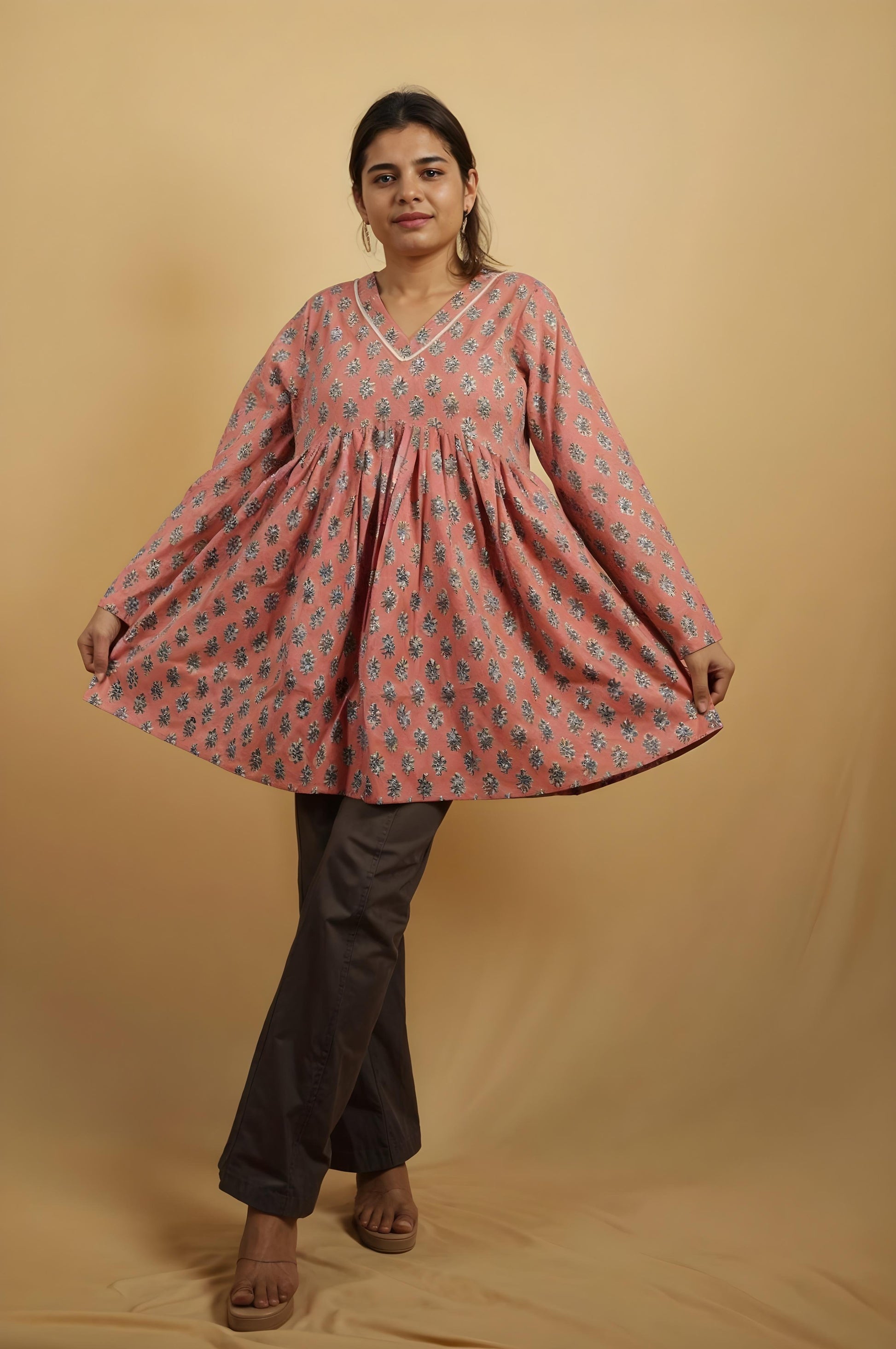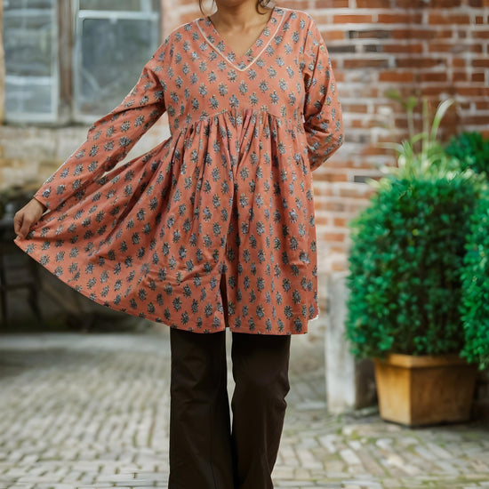 Add a touch of elegance and comfort to your everyday wardrobe with this fine print flared kurti from Nesara. Made from soft, breathable pure cotton fabric, it features an awesome print pattern that blends cultural charm with a traditional silhouette. The medium length makes it perfect for pairing with jeans or leggings, offering effortless style for casual outings, workwear, or college.