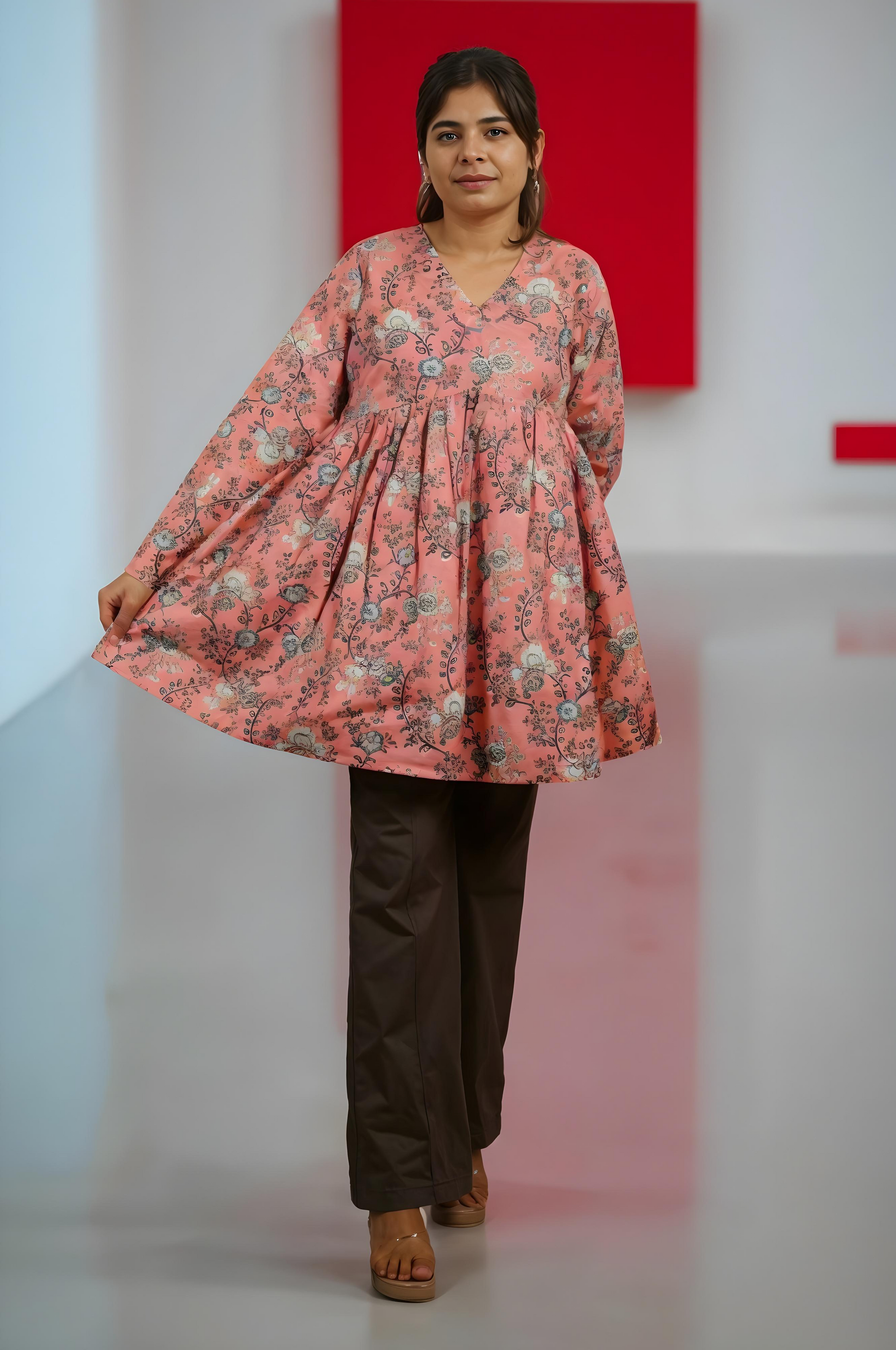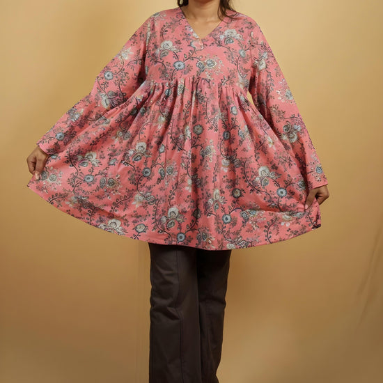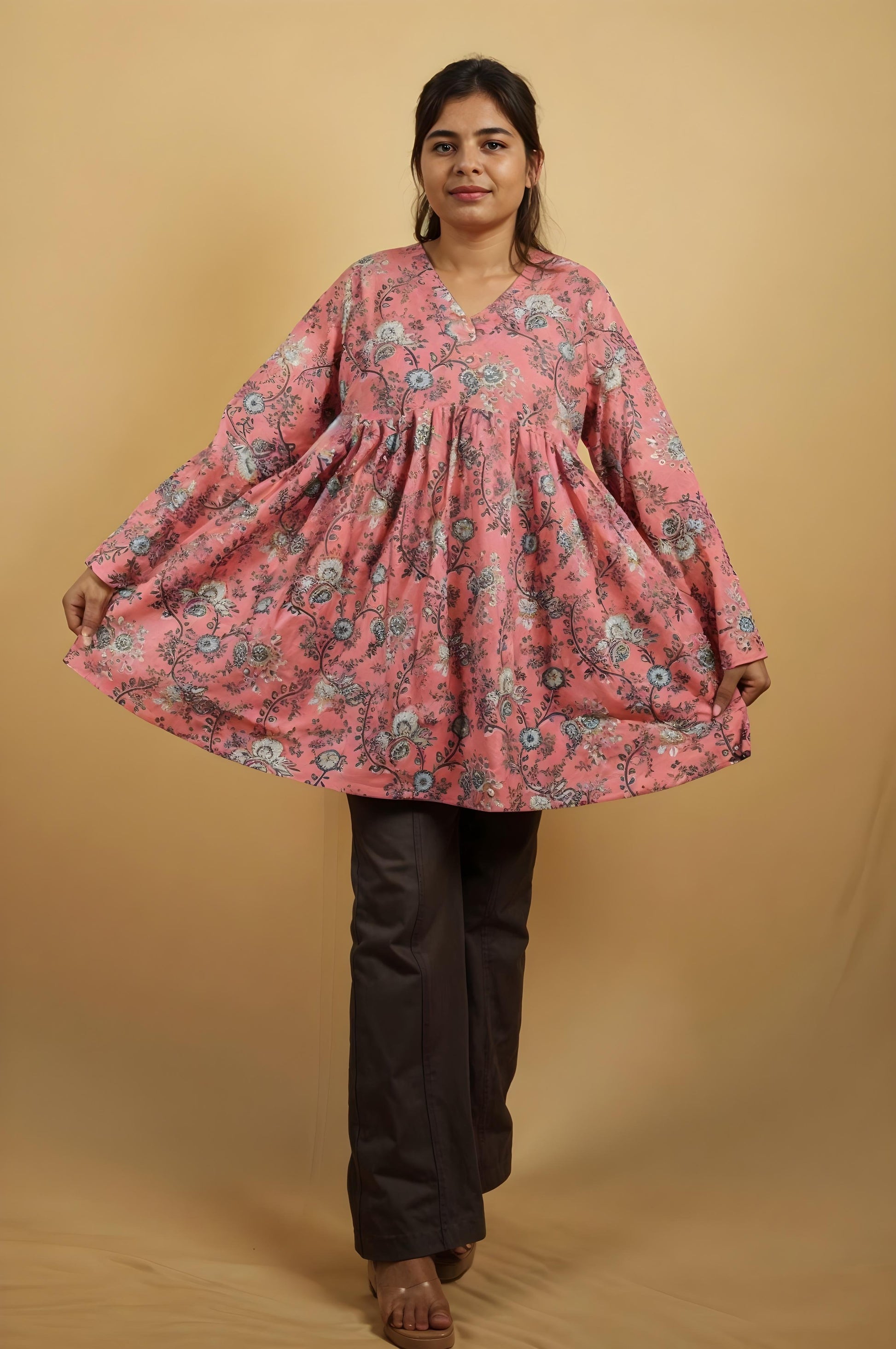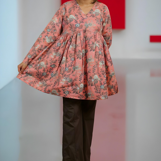 Add a touch of elegance and comfort to your everyday wardrobe with this fine print flared kurti from Nesara. Made from soft, breathable pure cotton fabric, it features an awesome print pattern that blends cultural charm with a traditional silhouette. The medium length makes it perfect for pairing with jeans or leggings, offering effortless style for casual outings, workwear, or college.