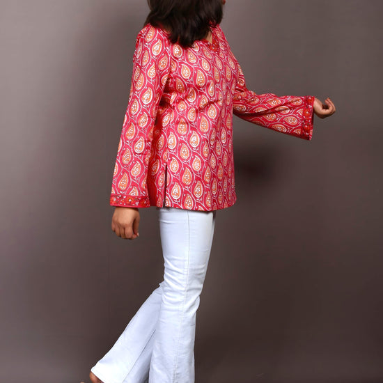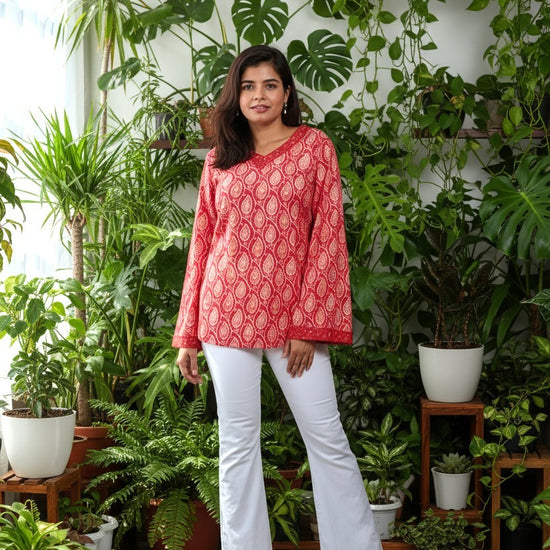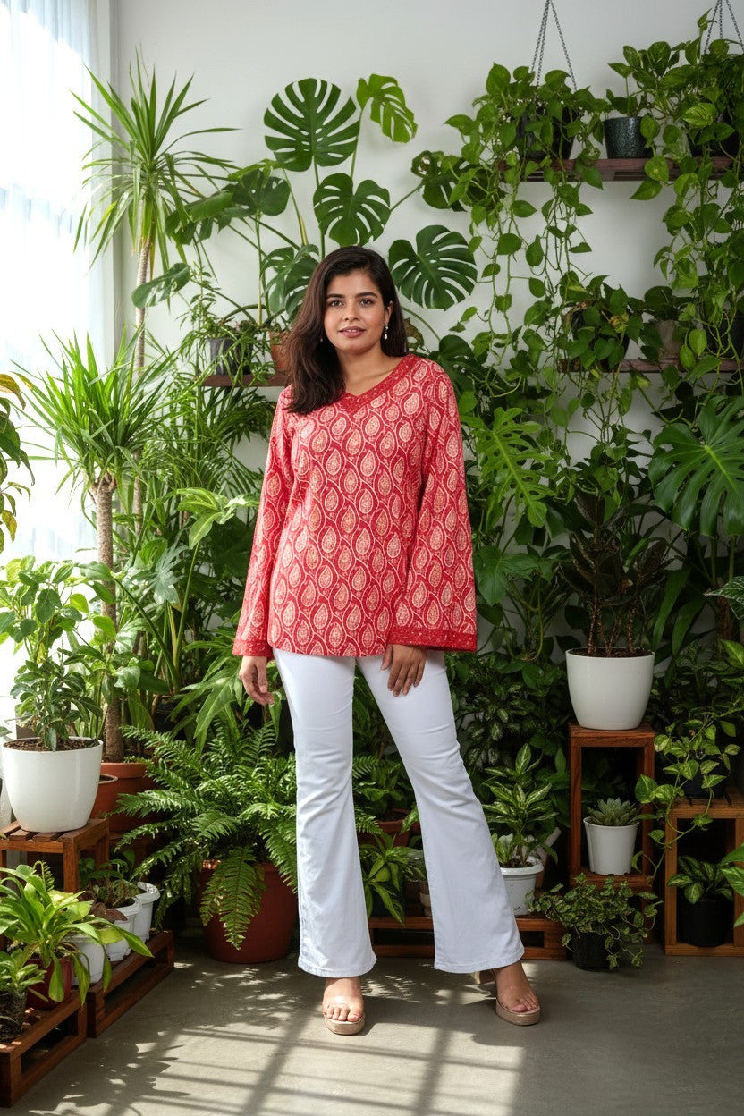 Add a touch of elegance and comfort to your everyday wardrobe with this fine print short kurti from Nesara. Made from soft, breathable pure cotton fabric, it features an awesome print pattern that blends cultural charm with a youthful silhouette. The short length makes it perfect for pairing with jeans or leggings, offering effortless style for casual outings, workwear, or college.